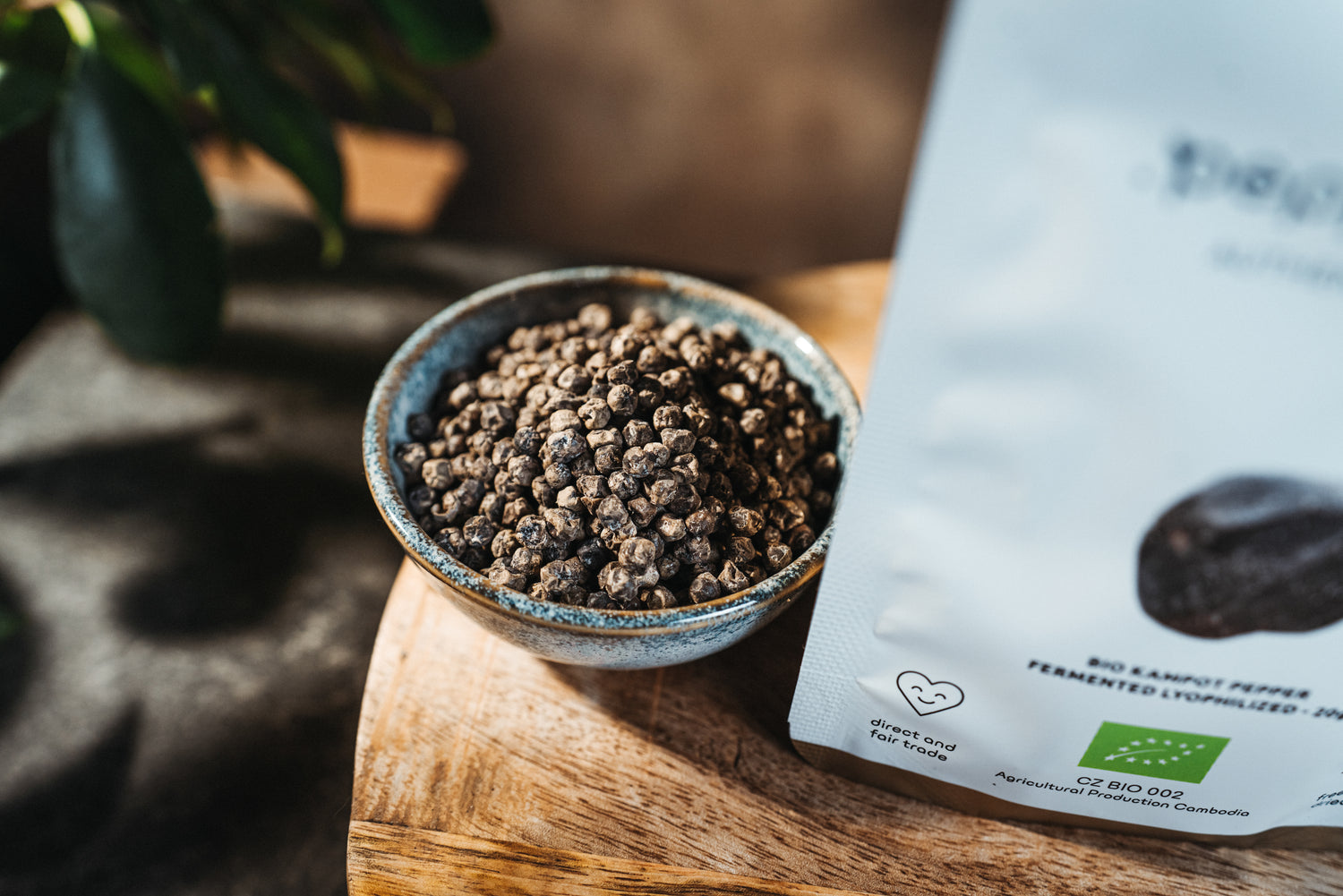 They are not traditionally sun-dried, but instead undergo the so-called freeze-drying process. During this process, the peppercorns are dried with frost, which removes their moisture. The added Kampot salt keeps the peppercorns fresh even during transportation. Once unpacked, all they need is a drop of oil or water to restore the moisture, which the frost-dried peppercorns reabsorb, and they regain their texture and flavor, as if you had just plucked them from the pepper vine.