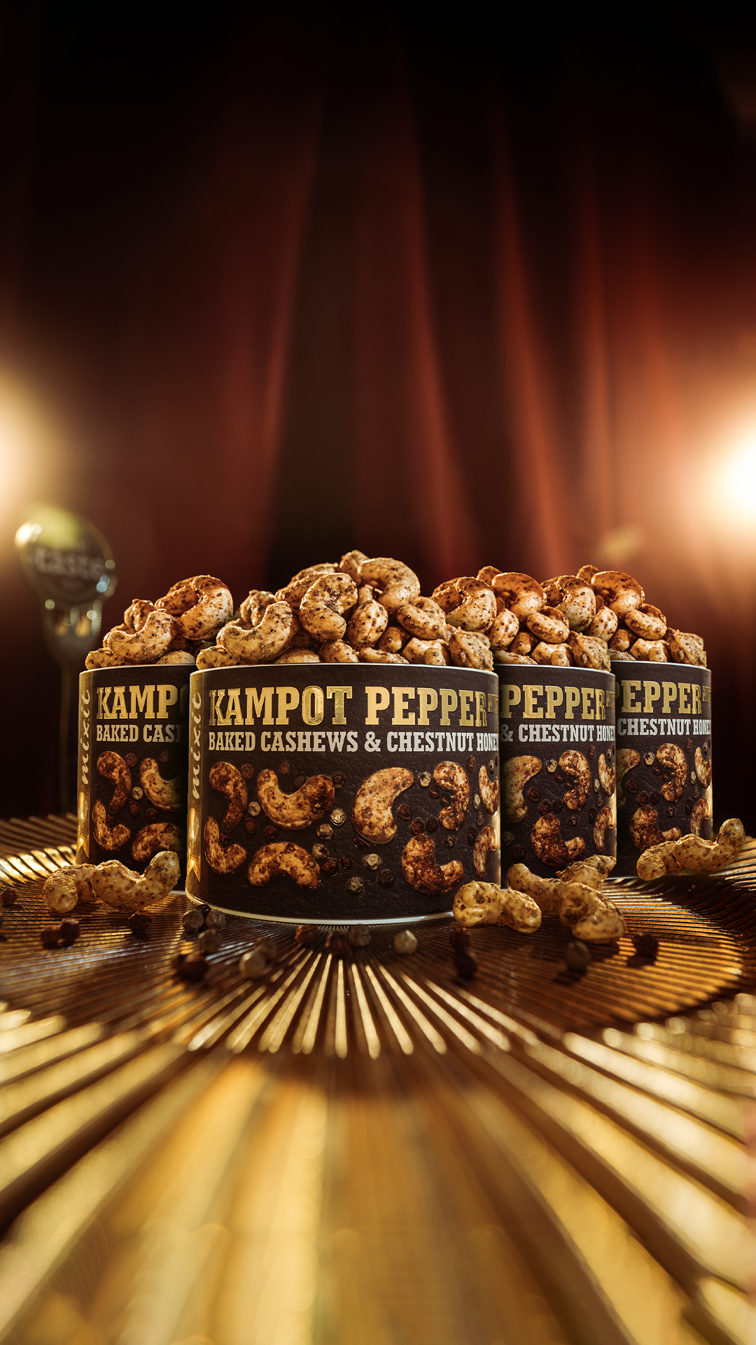 We complemented the flavor of premium cashew nuts roasted in an oven with the sweet caress of rich chestnut honey, and for an extra kick, we added two of our winning Kampot peppers.