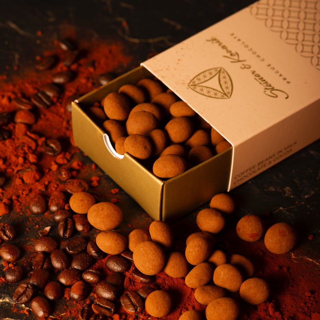 • Grains de café torréfiés enrobés de chocolat au lait avec cacao