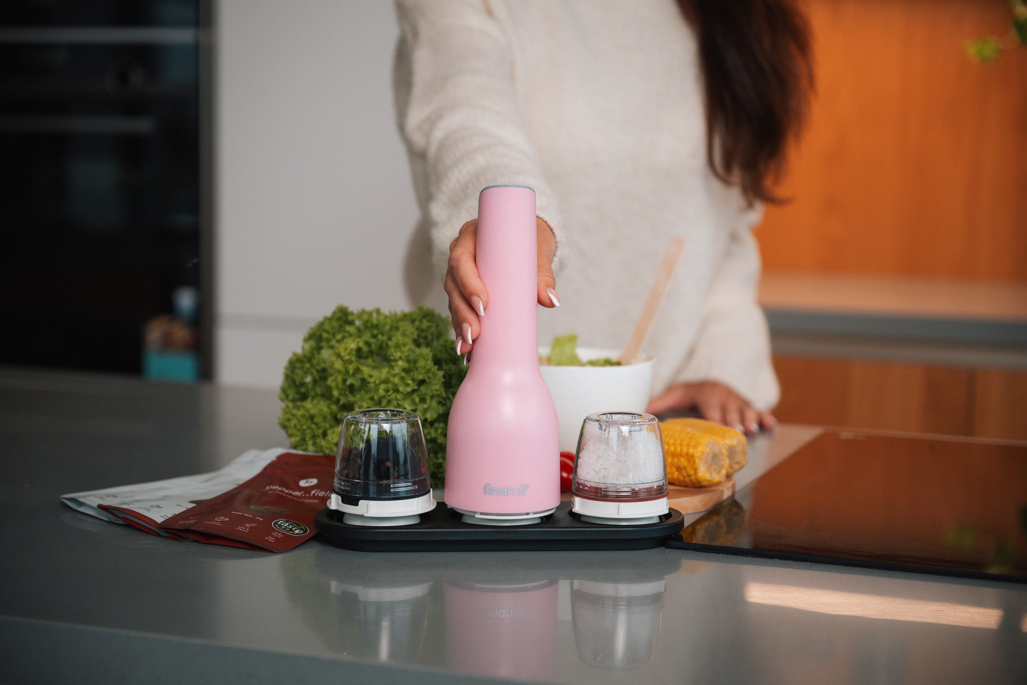 „Čerstvě namleté koření prostě chutná lépe. Předem namleté koření v dózách časem ztrácí svou chuť, protože se z něj odpařují přírodní oleje. Ruční mletí je ale náročné a zdlouhavé. FinaMill přináší novou koncepci mlýnku na koření – elektrické mletí nejen pepře, ale i sezamu, česneku, cibule a nespočtu dalších přísad díky vyměnitelným zásobníkům. Pro mletí stačí stisknout tlačítko. A vyměnit zásobník uprostřed vaření za jiné koření je stejně snadné.“