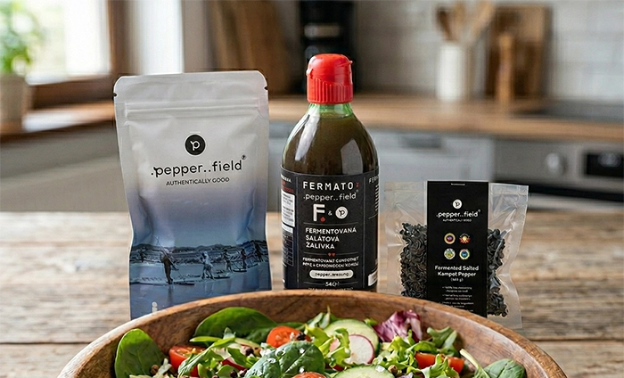 Fermentace potravin zlepšuje jejich stravitelnost a dodává jim typickou návykovou chuť umami (známou jako tzv. přírodní glutamát). Chuť umami je často to, co dodává jídlu největší šmrnc. Proto kombinace fermentované omáčky s naším fermentovaným pepřem byla jasná volba.